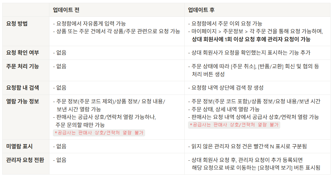 - 단, 주문 관련하여 최초 1회는 주문 내역 옆 ‘요청하기’를 통해 요청해야 합니다. 또한, 주문(반품/교환 포함) 관련하여 관리자에게 요청하려면, 해당 주문 건 기준 상대 회원사에게 소통 요청한 이력이 1회 이상 있는 경우에만 관리자에게 요청 가능합니다.