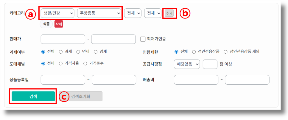 ② 검색필터 - 카테고리에서 아래와 같이 추가해보세요! (이미지 內 ⓐ, ⓑ)