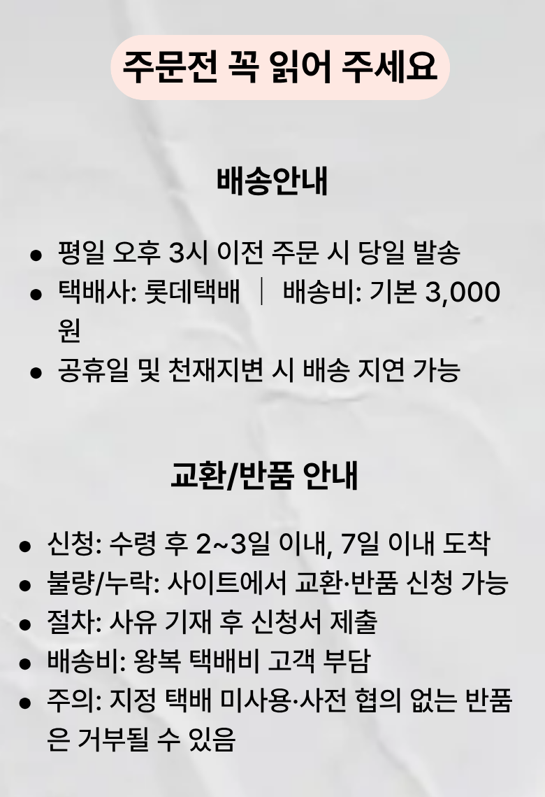 3. [반품/교환/누락] 신청 시 공급사와 반품사유, 택배사, 배송비, 반품지 주소 등을 협의하신 후 공급사에 수거접수 요청을 하거나 반품 상품을 발송해주시기 바랍니다. 협의되지 않은 택배사 이용으로 인해 추가로 발생되는 비용은 구매자 부담입니다.