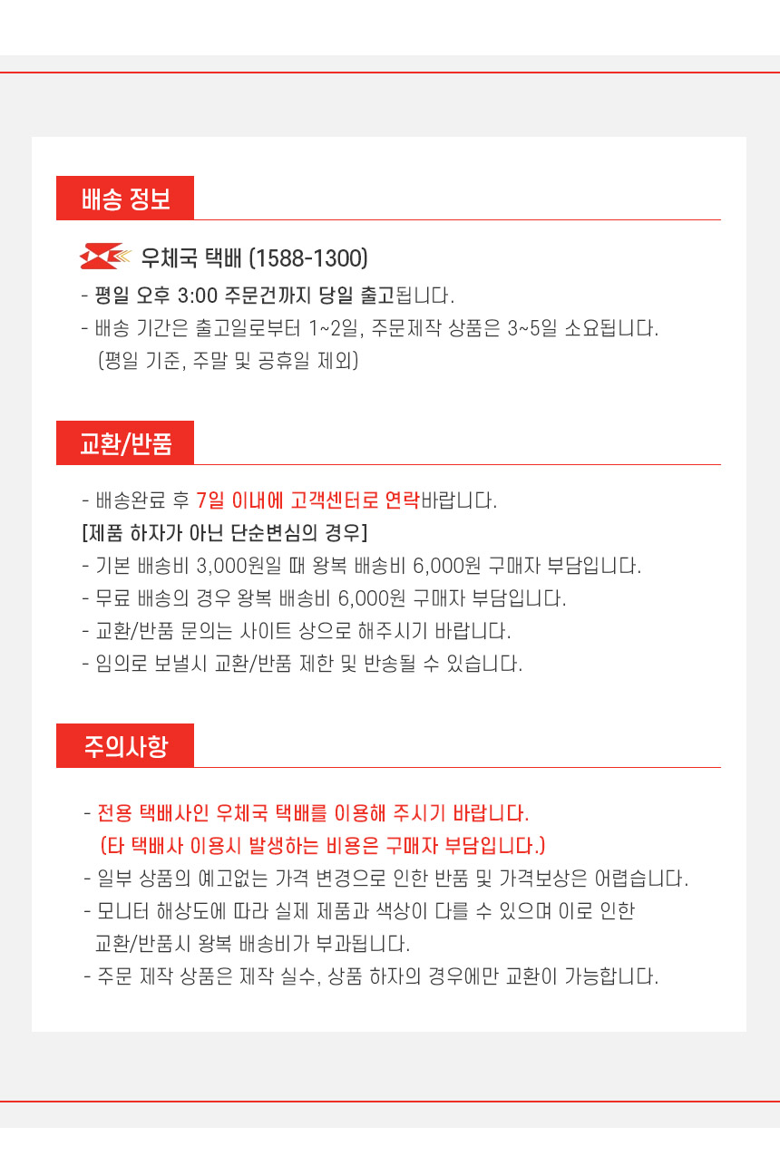 3. [반품/교환/누락] 신청 시 공급사와 반품사유, 택배사, 배송비, 반품지 주소 등을 협의하신 후 공급사에 수거접수 요청을 하거나 반품 상품을 발송해주시기 바랍니다. 협의되지 않은 택배사 이용으로 인해 추가로 발생되는 비용은 구매자 부담입니다.